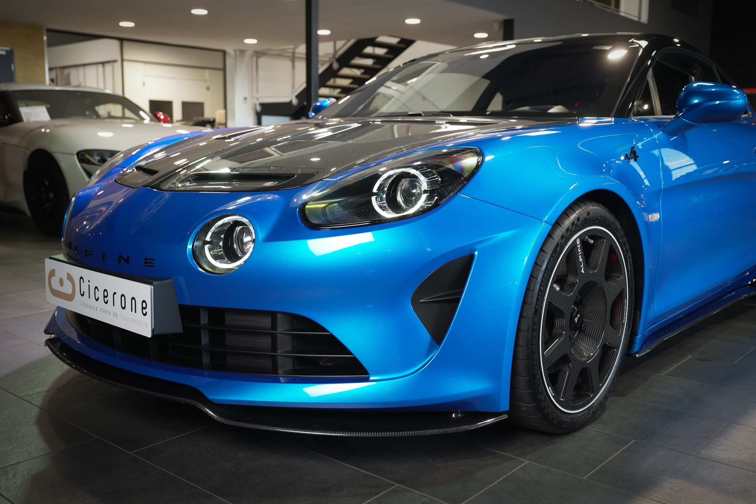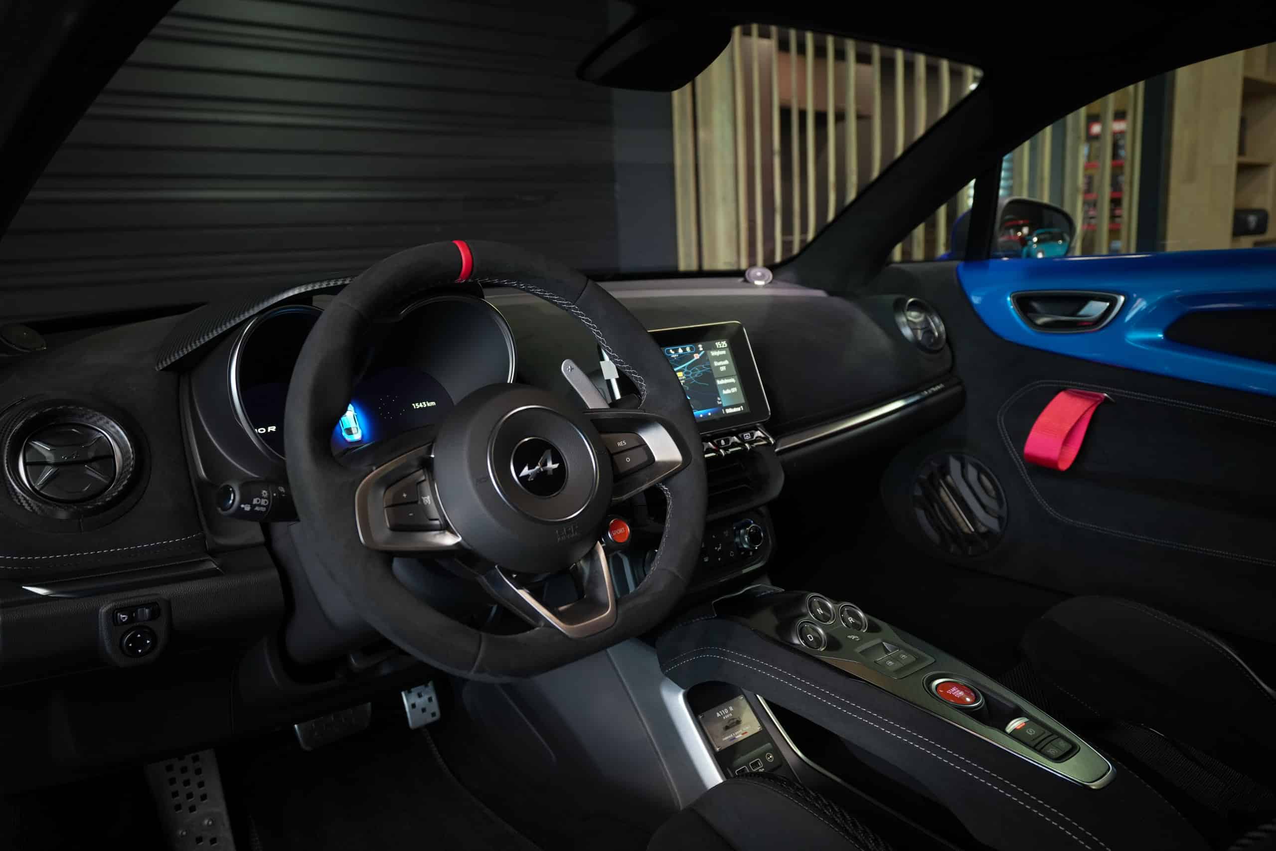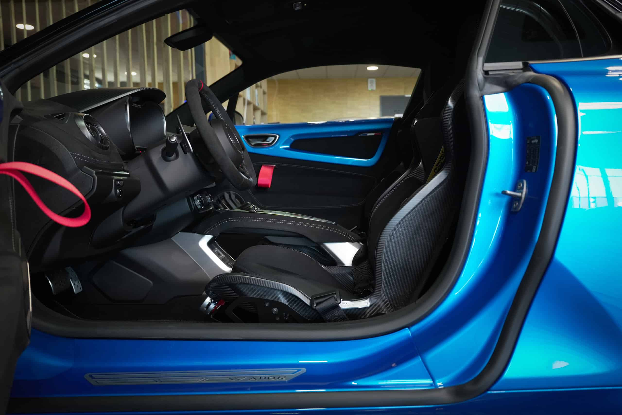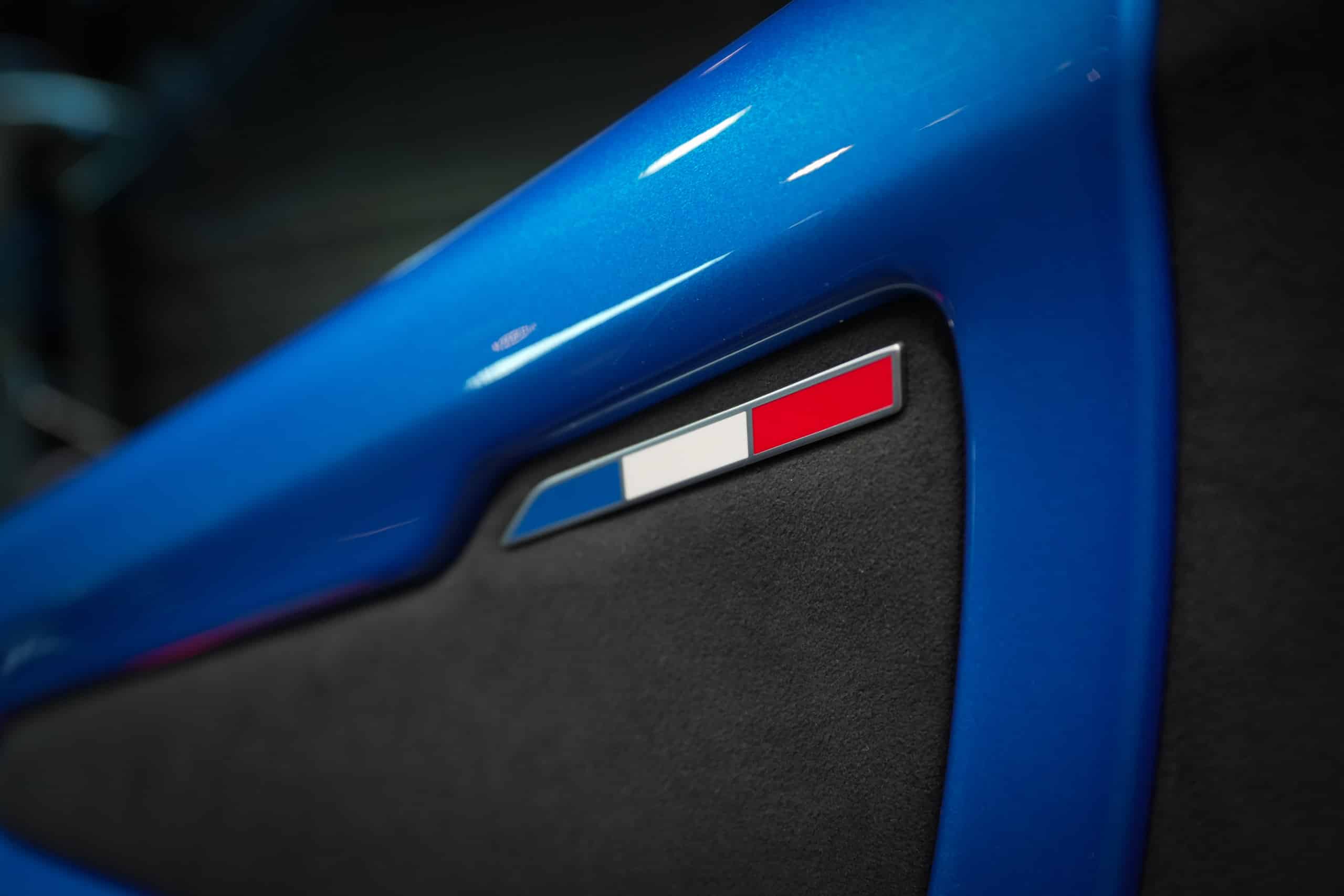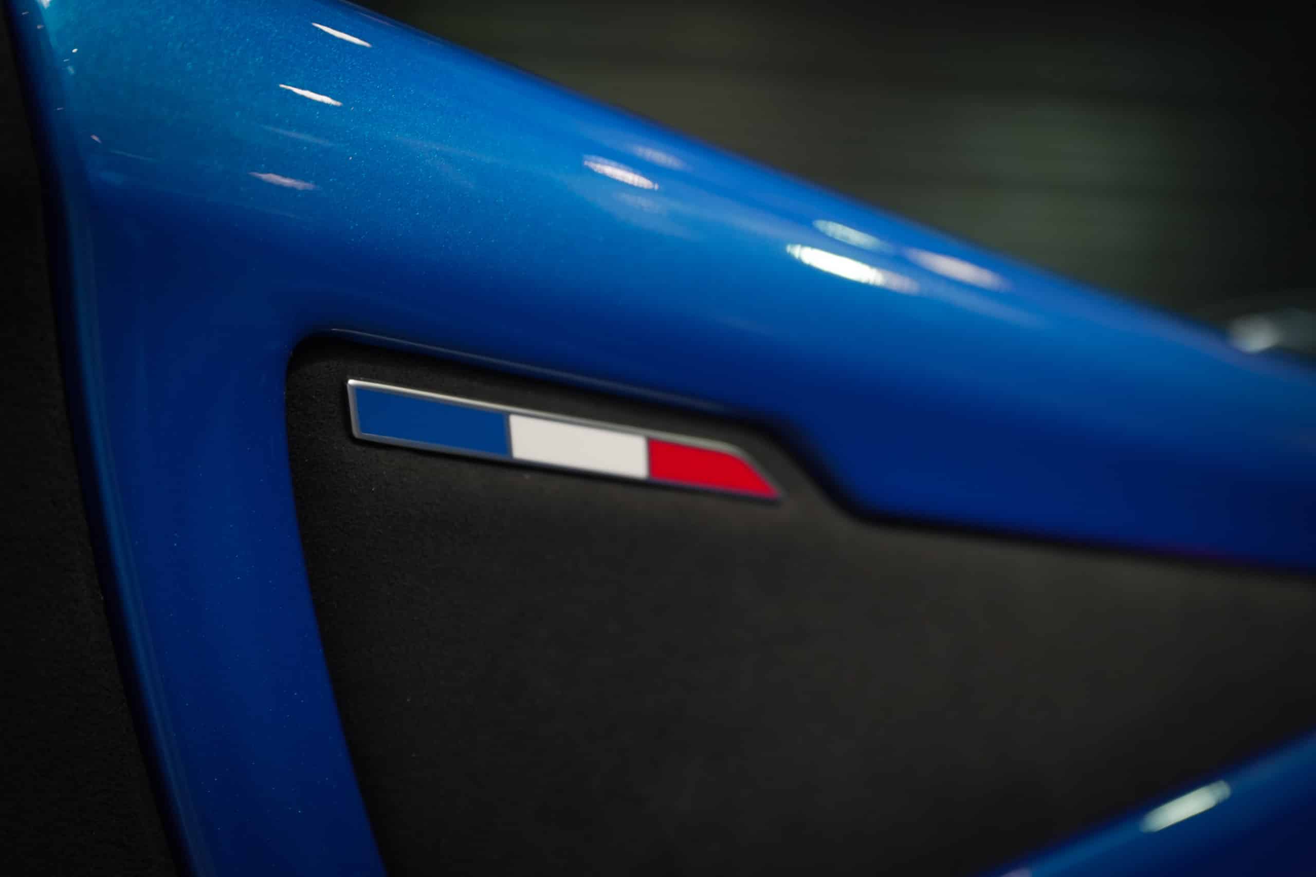 Présentée dans la très désirable teinte Bleu Alpine, cette A110 R incarne la vision la plus radicale et aboutie du modèle : châssis allégé spécifique, carrosserie largement en carbone, suspensions sport réglables, freinage Brembo, pneus Michelin Cup 2 et échappement sport titane. Les sièges baquets carbone Sabelt avec harnais six points soulignent son ADN résolument tourné vers la performance.