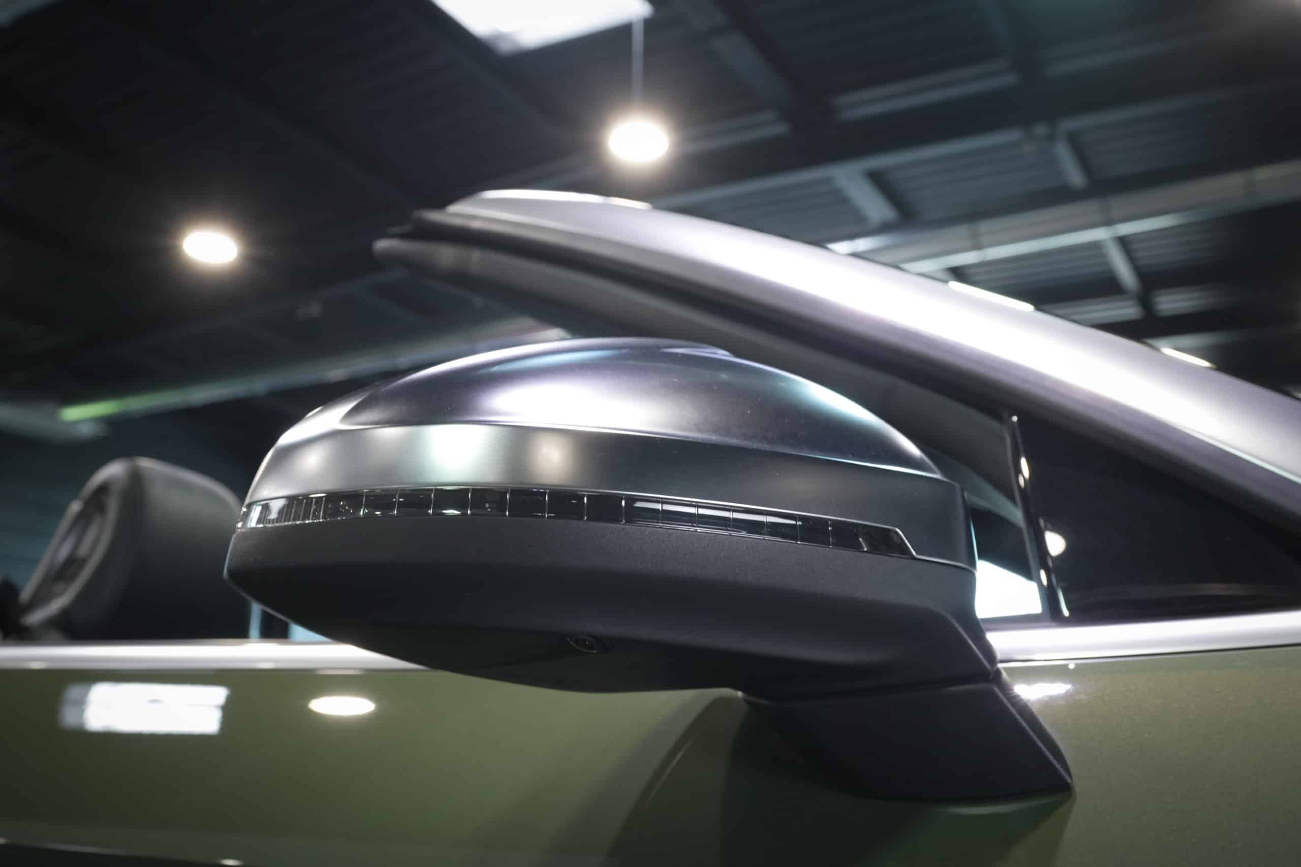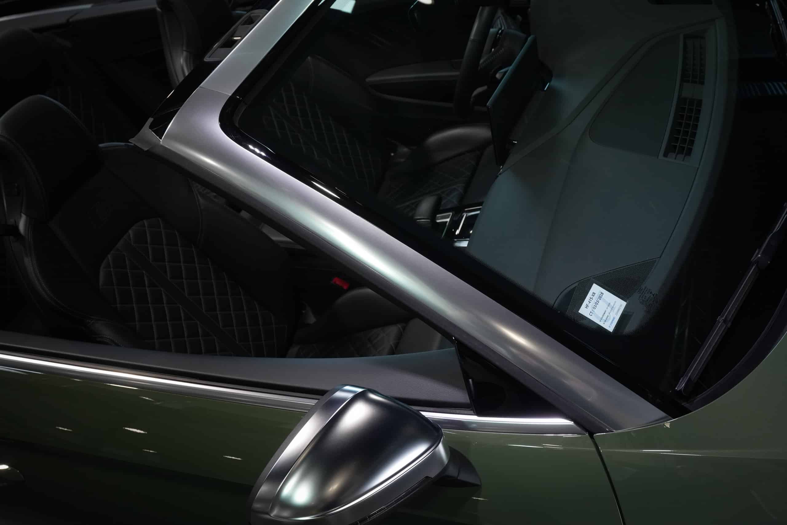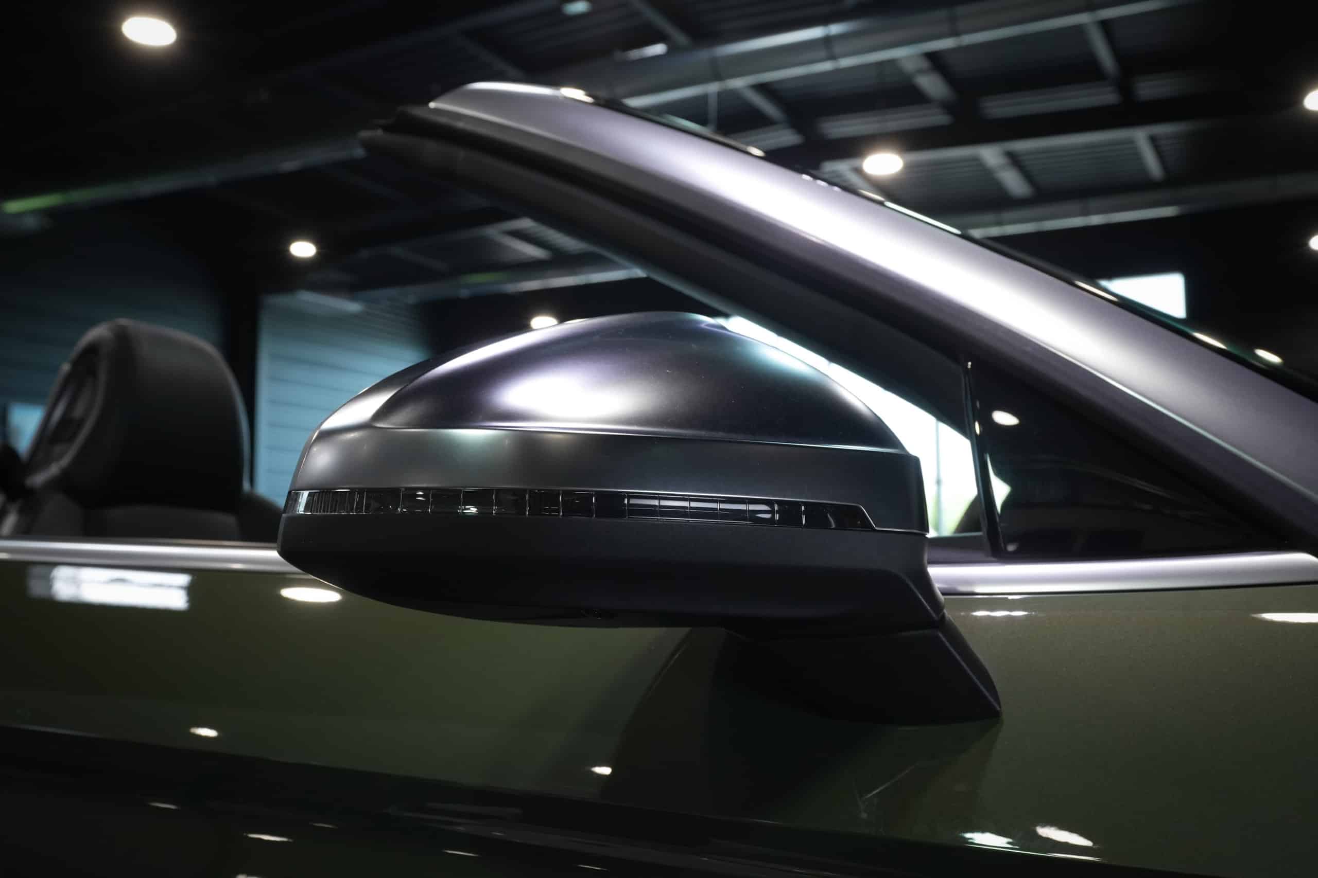 Cet exemplaire se distingue avant tout par sa teinte rare Distriktgrün métallisé, une configuration peu commune qui met en valeur les lignes élégantes du cabriolet et renforce son exclusivité.